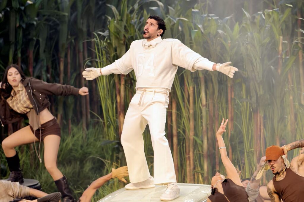 Na apresentação, Bad Bunny conseguiu levar ao gramado do Levi’s Stadium, em Santa Clara, um pouco de Porto Rico ao recriar cenas cotidianas do território centro-americano, como plantações de cana e banana, barracas de tacos e de compra e venda de prata, idosos jogando dominó na praça e um casamento tipicamente caribenho.