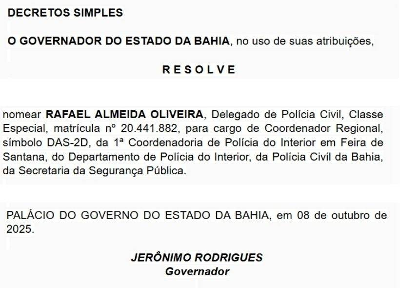 Nesta quarta-feira foi publicado no Diário Oficial do Estado da Bahia mudanças na 1ª Coordenadoria de Polícia do Interior (Coorpin) em Feira de Santana, o delegado Rafael Almeida Oliveira foi nomeado o novo coordenador, ele atuava na cidade de Alagoinhas, na 2ª Coordenadoria de Polícia do Interior (Coorpin), cargo que assumiu em 2023.